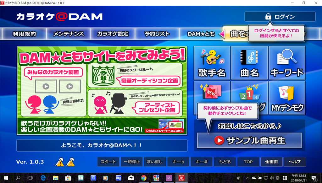 登入後會看到「サンプル曲再生」不見了,原先位置變成「精密採点Win10」,鎖頭也打開,就能任選想唱的歌。除了歌手名、歌曲名、關鍵字(キーワード),還能查看新曲、排行(ランキング)和自己的選歌紀錄(MYデンモク)。